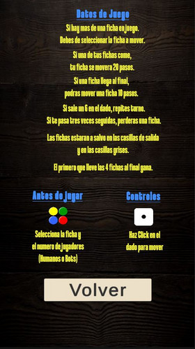 - Cada jugador tiene 4 fichas que deben recorrer todo el tablero y llegar a su casilla final.